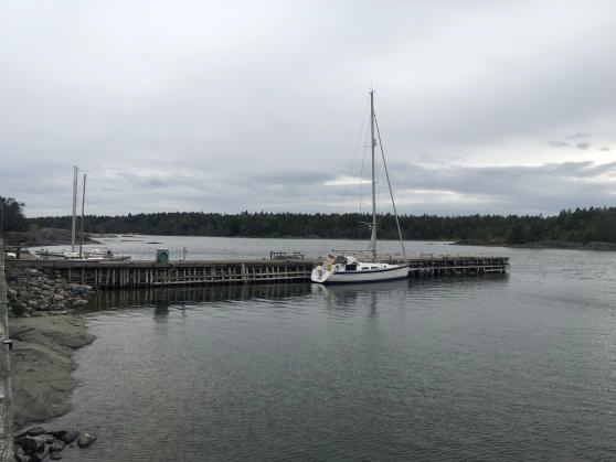 Am 27. Mai erwärmte die Morgensonne nach kalter wolkenloser Nacht (8°C) das Schiff. Wir segelten mit SW und SSW 4-5Bft, ablandig und böig, am ursprünglichen Ziel Öregrund vorbei. Erstens, weil Öregund optisch keinen einladenden Eindruck auf uns machte und mit prohibitiv hohen Hafengebühren abschreckte, und zweitens um das (noch) schöne Segelwetter zu nutzen. So fuhren wir nach Ängskär (52nm), eigentlich erst für den Folgetag geplant. Dort lagen wir längsseits in Lee hinter einer hohen Pier, so dass uns die nächtlichen SSW-Böen bis 28kn kaum etwas anhaben konnten (Foto rechts).