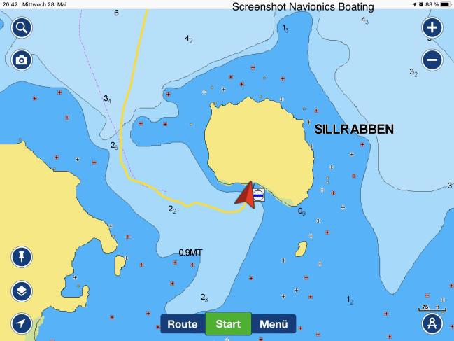 Track der zweiten Etappe, aufgezeichnet mit der Navigations-App iSailor. Statistische Daten der zweiten Etappe: 163nm, davon 2nm unter Motor. Motorstunden 1h 9min.
