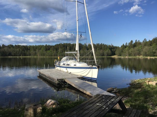 Wir waren nun unserem Reiseplan um einen Tag voraus, konnten also einen ungeplanten Stop einlegen. Da Brot an Bord knapp war, sollte es eigentlich in einen Hafen mit Einkaufsmöglichkeit gehen. Wir entschieden uns aber dagegen und für Müsli, Cornflakes und Zwieback zum Frühstück. Denn es lockte ein winziger Steg in Sillrabben, 5nm vor Gävle, im Naturreservat. Zufällig in der Navionics-App entdeckt und dank einer HydrographicaDetailkarte in der App auch für uns mit 2m Tiefgang ansteuerbar. Dahin zu gelangen machte uns der Wind schwer: Auslaufend aus Ängskär erst noch böiger SSW. Die vorhergesagte Drehung auf SE blieb aus, statt dessen W mit 2-3Bft. Aber nur für 90 Minuten, dann Flaute. Nach 30 Minuten Wartezeit dann Wind aus E, langsam zunehmend auf 3Bft. So kamen wir später in Sillrabben (32nm) an als gedacht. Der Steg war noch kürzer als erwartet, kürzer als das Schiff. An Land ein brütender